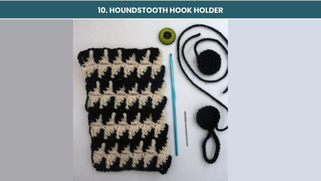 Want to elevate your hook storage with style? The Houndstooth Hook Holder by Michelle at Book People Studio is a trendy case featuring dividers to separate your hooks! You’ll need Light Worsted Weight Yarn and a 3.5 mm (E) crochet hook. The finished size is about 7 inches tall, making it a chic and practical addition to your crafting collection!